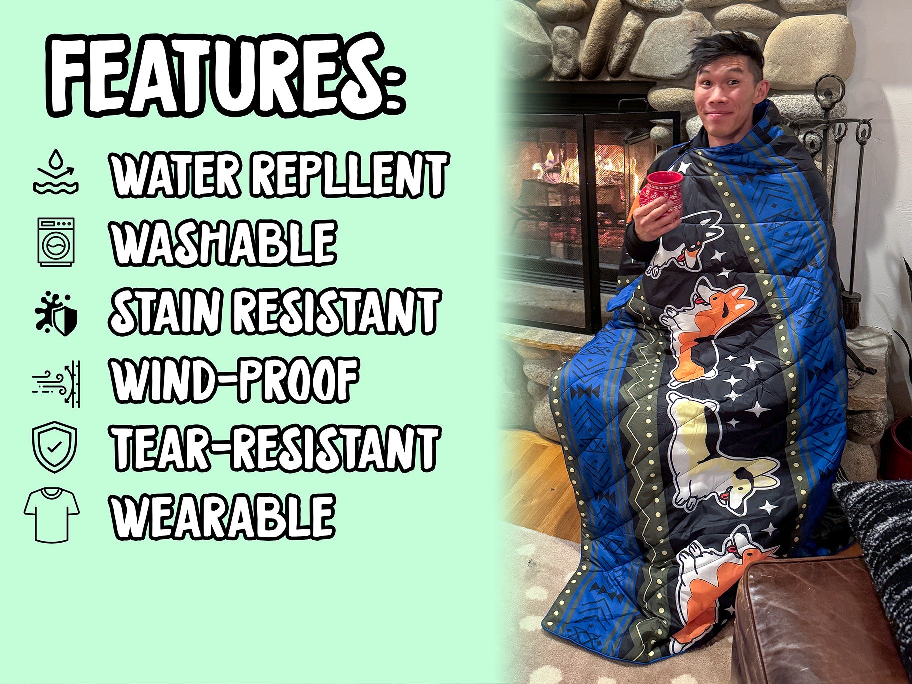 Take your adventures to the next level with the Limited Edition Puffy Corgi Camping Blanket! Whether you're picnicking, camping, or cuddling up at home, this versatile blanket is perfect for any outdoor or indoor activity with your Corgi. Featuring four different types of Corgis in a charming wilderness design, it's as playful as it is practical. Crafted from Ripstop material, it’s water-resistant, durable, washable, stain-resistant, and windproof, ensuring it can withstand your adventures. The blanket conveniently comes in a drawstring bag and includes a built-in buckle so you can wear it like a poncho when you need extra warmth. Measuring 54"x80" with soft cotton filling, this cozy companion is perfect for staying comfortable on the go.
