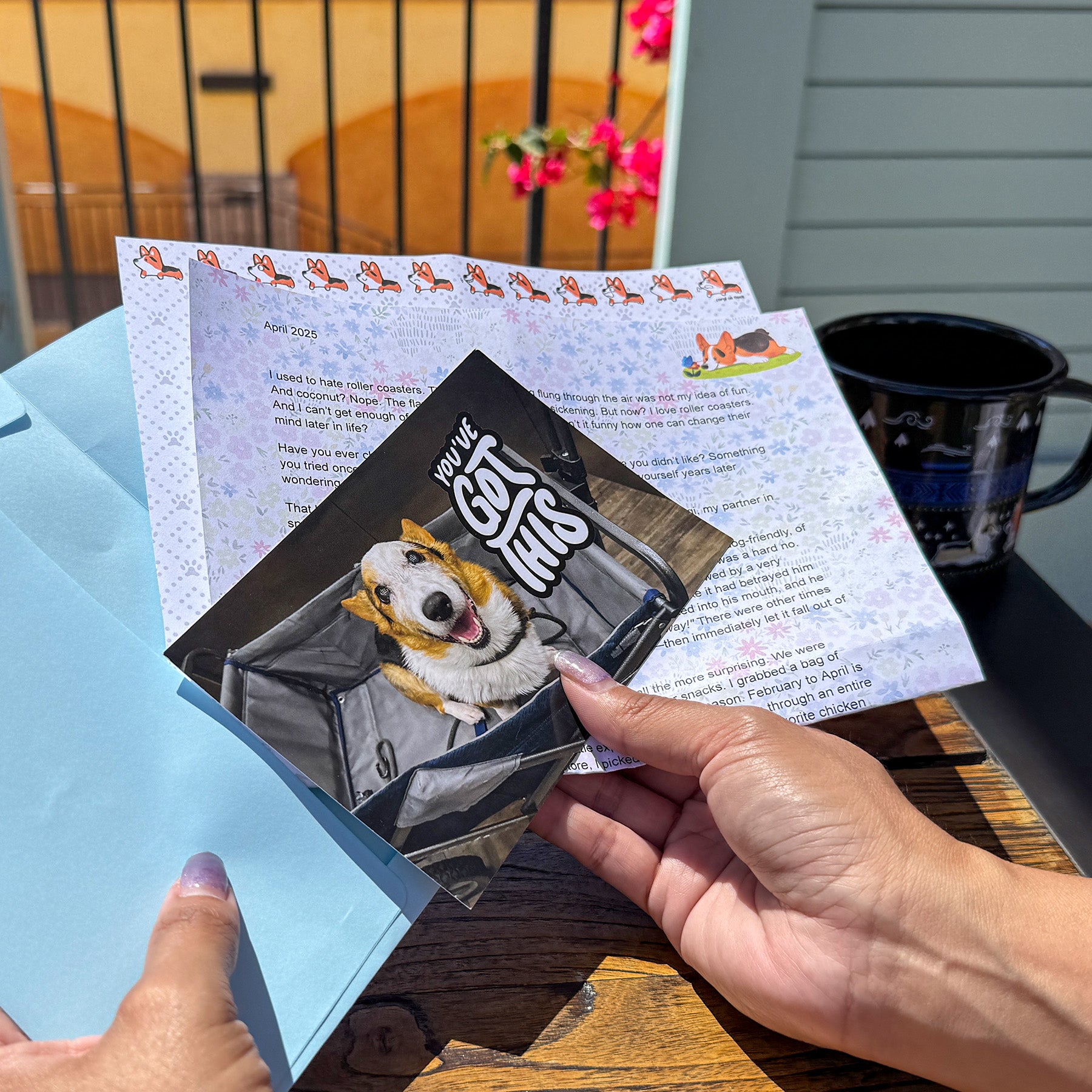 Each letter will be different. But you will receive a new monthly letter from Ryen covering his relationship with Gatsby, his corgi dog. The letter will be uplifting with themes of inspiration and corgis.